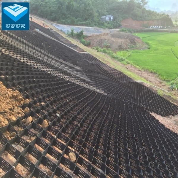 Geocells are made of high-strength HDPE broadband, which is strongly welded to form a piece of mesh-like cell structure. It is stretchable, can be folded up when transported, open and filled with soil, stone, or concrete material when used, constituting a structure with strong lateral restriction and large stiffness.